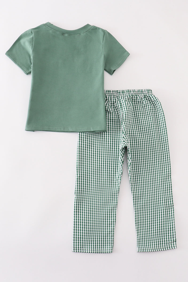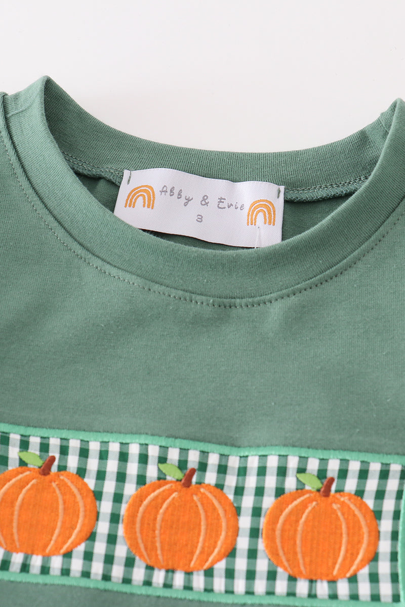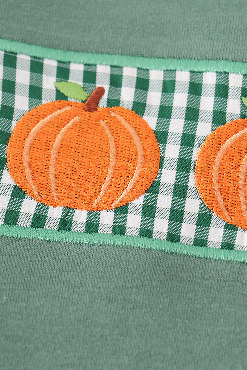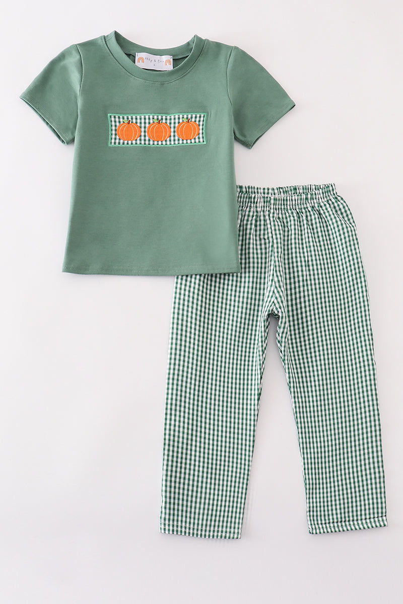 Get your little man ready for fall with our Green Gingham Pumpkin Embroidery Boy Set! This adorable set features a charming gingham print and playful pumpkin embroidery, perfect for the season. With its quirky design and comfortable fit, your little one will be looking stylish while staying comfortable. (Pumpkin spice latte not included.)